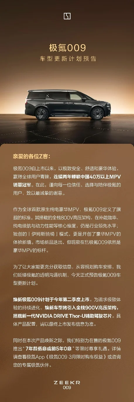 据悉,极氪汽车计划于2026年第二季度推出全新升级版的极氪009车型。新车将采用全栈900V高压架构,并配备新一代NVIDIA DRIVE Thor-U辅助驾驶系统,为用户提供更奢华且前沿的豪华出行体验。