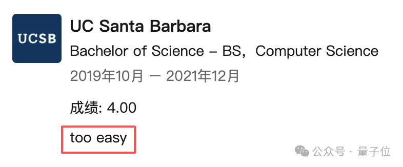 比如,他说自己在加州大学圣塔芭芭拉分校仅用三年便完成了本科课程,并且成绩全优,认为这「太容易」了。