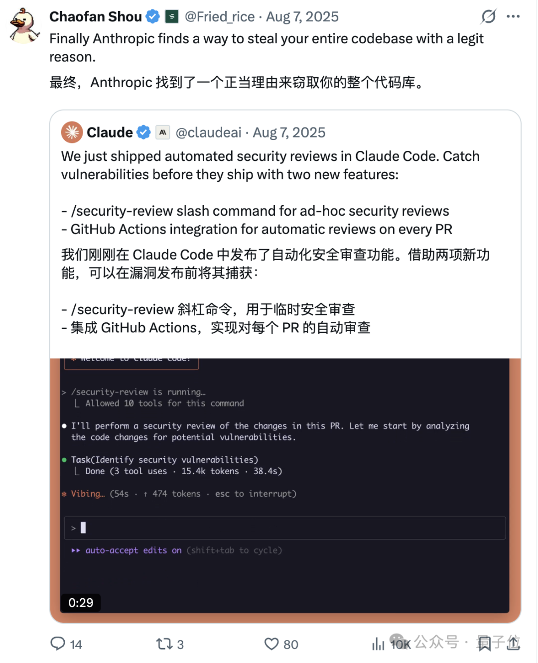 当时Claude发布了关于安全审查的新功能,但Chaofan直接开怼,说Anthropic是借着新功能的幌子,窃取用户的代码库。