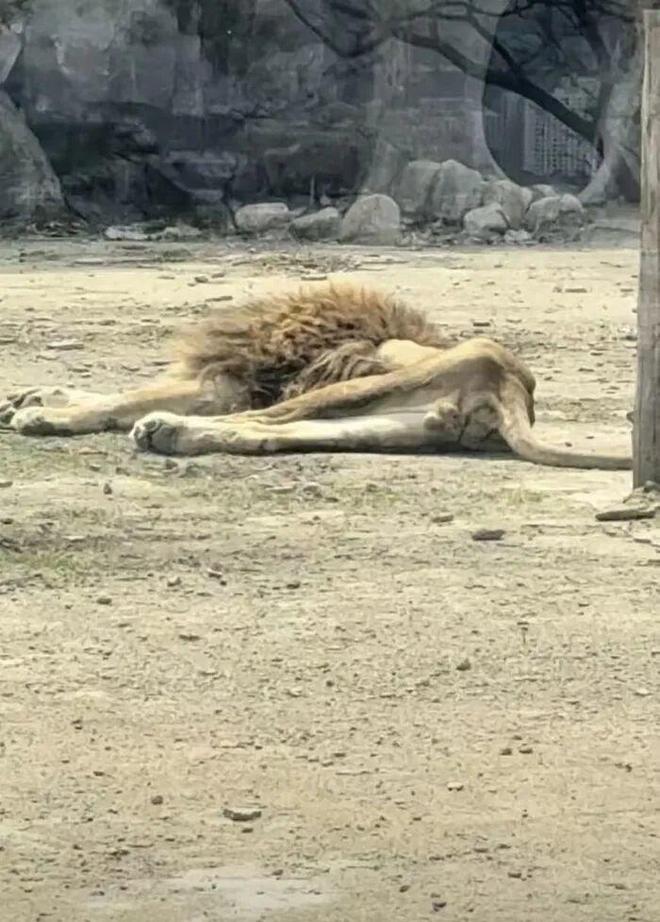 视频中可以看到园区内的雄性狮子躺在地上,体型较瘦,骨骼清晰可见。该视频拍摄地点为本溪市动植物园。