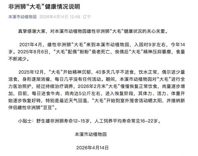 本溪市动植物园于4月14日中午通过其官方微信号发布了关于雄性非洲狮“大毛”健康状况的说明,回应了公众的关注。