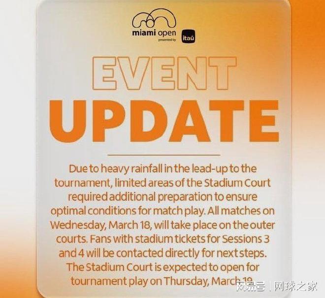 昨晚,原定于今天进行的ATP1000迈阿密大师赛和WTA1000迈阿密站第二轮比赛因大雨被迫推迟。由于雨势持续,比赛最终被取消。