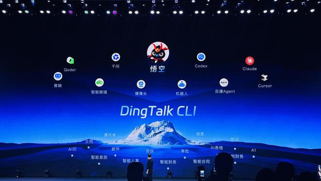DingTalk CLI向上支持悟空以及千问、Claude、Qoder等内外部的Agent产品及模型,可接入智能眼镜、机器人等多种设备;向下内置钉钉已有的文档、邮件、会议、审批等众多功能组件。