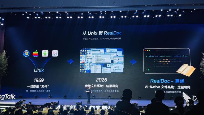 “AI会比人类更加高频地调用文件。”陈航在现场回顾了文件系统的演进史:从1969年的Unix,到今天的RealDoc。他认为,AI-Native的文件系统应该是过程导向的保存,而不是结果导向的保存。换句话说,AI时代的文件不是给人操作的,是给AI操作的。