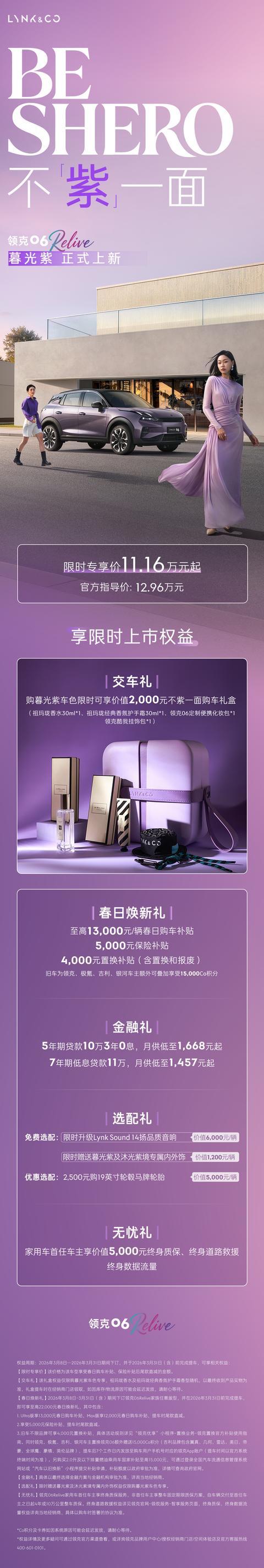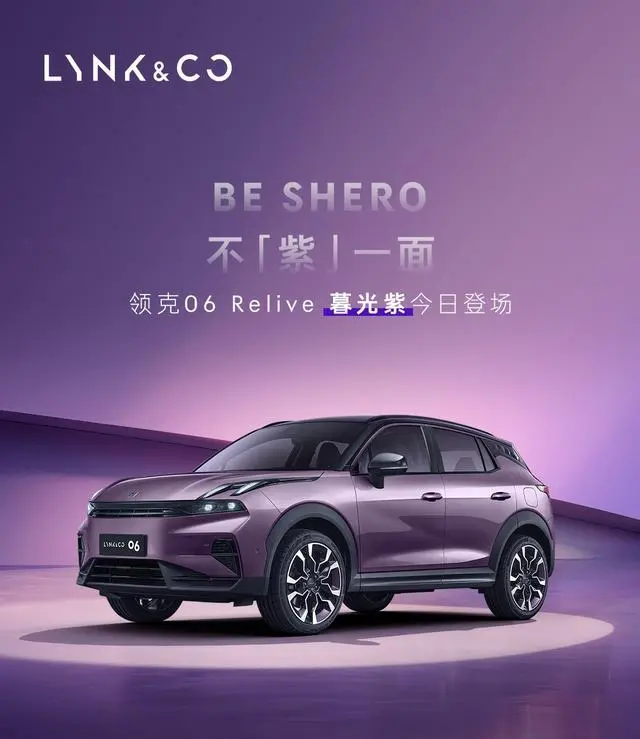 领克汽车今日发布消息称,推出领克 06 Relive 版本的新车色——暮光紫,并公布了官方指导价为 12.96 万元,同时提供限时优惠价格从 11.16 万元起,消费者还可享受最高达 22000 元的春日焕新礼。