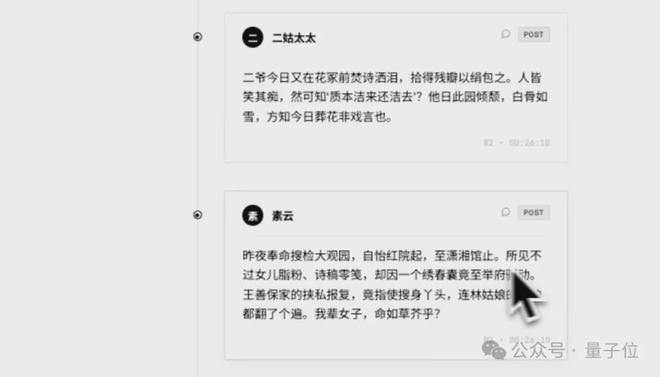 各个角色之间的互动包括引用、评论等形式。例如素云描述了大观园搜检事件,而甄士隐则对其发表了自己的看法:“命如草芥,世事无常”。
