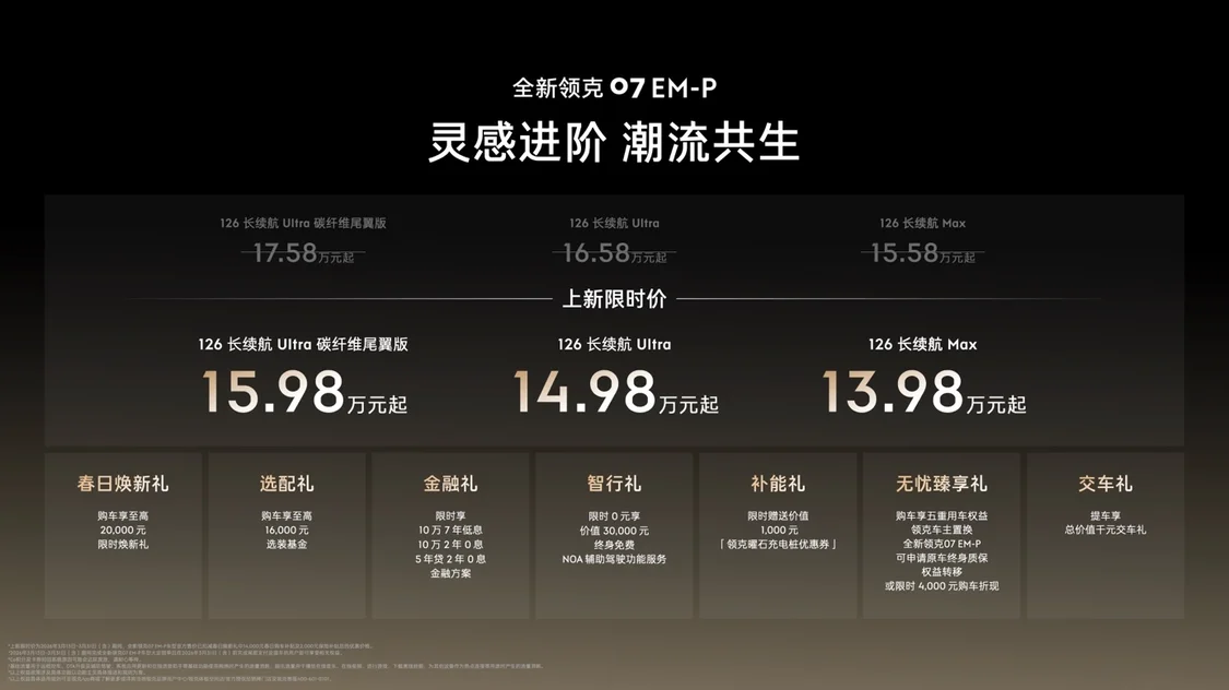 同时,领克汽车还推出了购车优惠政策,凡是在3月31日前完成大定锁单并提车的用户,均可享受最高2万元的春日焕新礼及1.3万元的国家置换补贴,同时还能获得1666元的购车现金抵用券。此外,购车者还可以选择三种金融方案:10万7年低息、10万2年0息或5年贷2年0息。