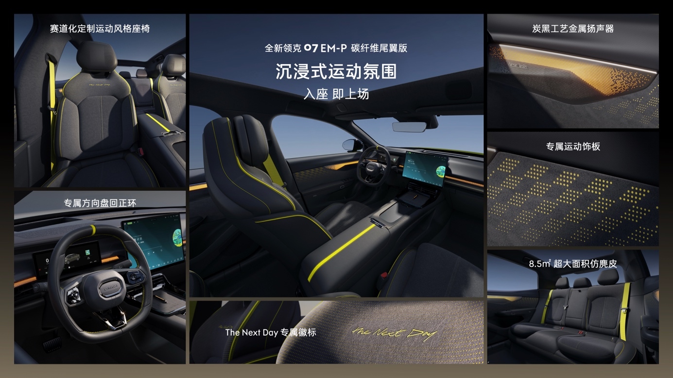在内饰方面,全新领克07 EM-P采用了定制的赛道化运动风格座舱设计,整体内饰采用暗耀黑配色,车厢内使用了8.5平方米的仿麂皮材料,并搭配独特的方格旗设计的专属运动饰板,以及座椅上的The Next Day浮雕刺绣,以纪念TRC赛场上的辉煌时刻。