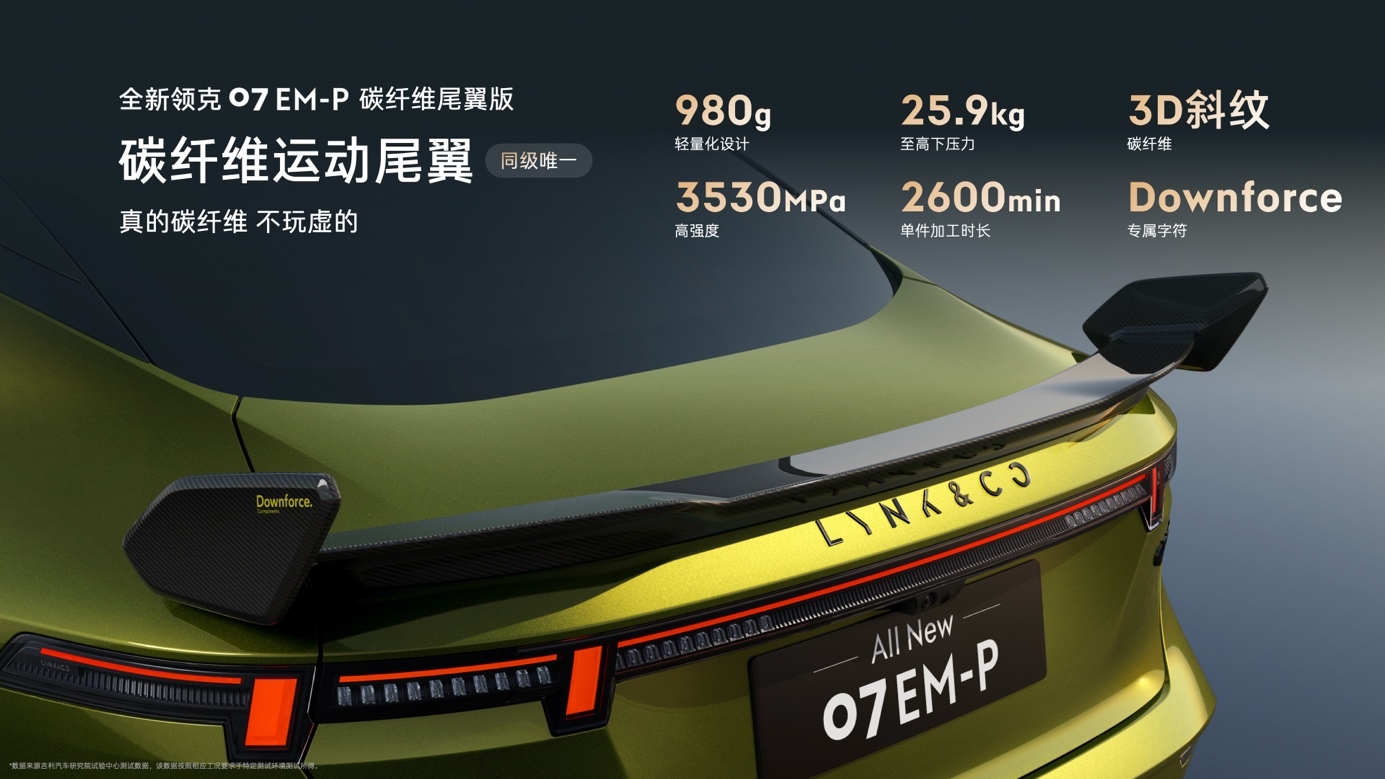 领克07 EM-P的碳纤维尾翼呈现均匀细密的3D斜纹编织,重量仅980克,能够在高速行驶时提供25.9公斤的下压力,提升车辆高速过弯及变道时的稳定性。尾翼上还刻有“DOWNFORCE”标识,彰显其独特身份。
