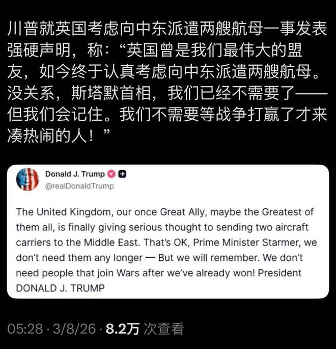 特朗普在其社交媒体账户上发文称,“我们曾伟大的盟友——或许是最伟大之一的英国,现在正认真考虑向该区域部署两艘航母。尽管我不再需要这些支援,但斯塔默首相会记住这次事件。”特朗普指出,在已经取得胜利之后才加入战争的人并非所愿。