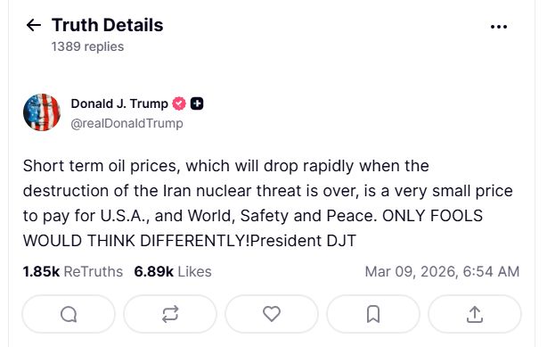 “短期内的油价上涨对于全球的安全与和谐而言不过是九牛一毛。那些持有不同观点的人在我看来是愚蠢至极。”他在帖子中这样写道。