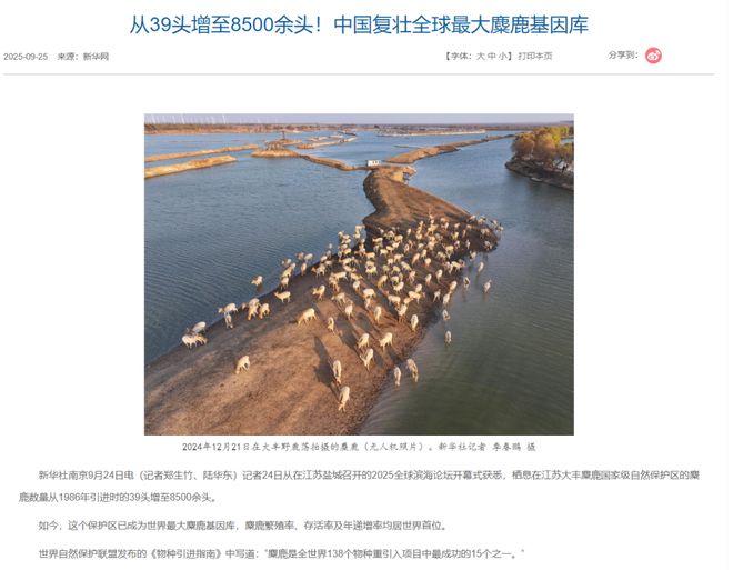 1986年,江苏大丰建立国家级麋鹿自然保护区,经过多年的保护,截至2025年,保护区内的麋鹿数量从引进初期的39头增至8500余头。