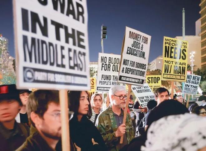 在2026年3月2日,洛杉矶的民众举行集会抗议美国对伊朗采取军事行动的行为。
