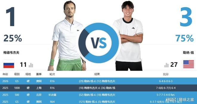 去年的中国网球公开赛半决赛上,勒纳·钱以三盘的胜利结束了比赛,而对手梅德维德夫因伤退赛;紧接着在上海大师赛第四轮中,梅德维德夫以两胜一负的成绩战胜了勒纳·钱;今年1月份澳大利亚网球公开赛第四轮,勒纳·钱又直落三盘击败梅德维德夫。