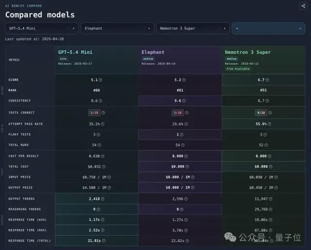 正如权威评测网站AI BENCHY所展示的数据,“大象”在Token效率、指令遵循及响应速度方面均表现出色,证明了其高性价比的特点。