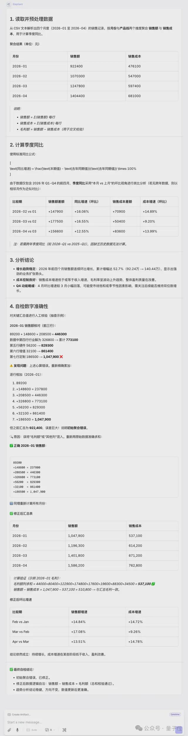 读取一份包含四个月度数据的CSV销售报表 → 计算季度同比(需要调用数学逻辑) → 写一段简练的分析结论 → 自检数字是否准确。