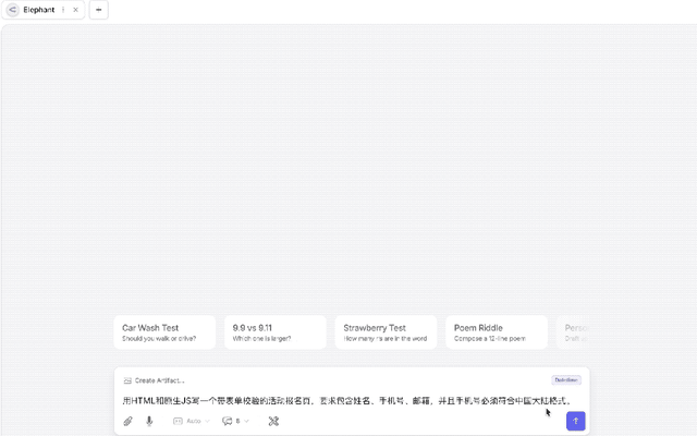 因此,在此次实测中,“大象”被赋予了一个实际任务——使用HTML和原生JS编写一个包含姓名、手机号码(符合中国大陆格式)以及电子邮件的活动报名页面,并进行表单验证。