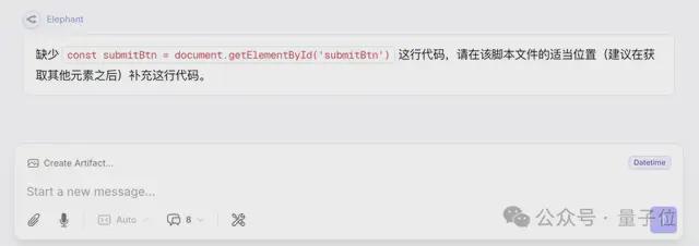 接下来,在故意删除提交按钮变量之后,“大象”依旧能准确识别问题并提供简洁的修复方案,而不会产生额外的Token消耗。