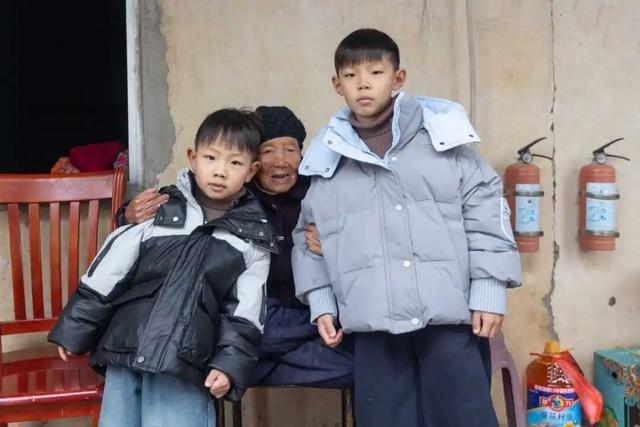 老人抱着两位小辈合影