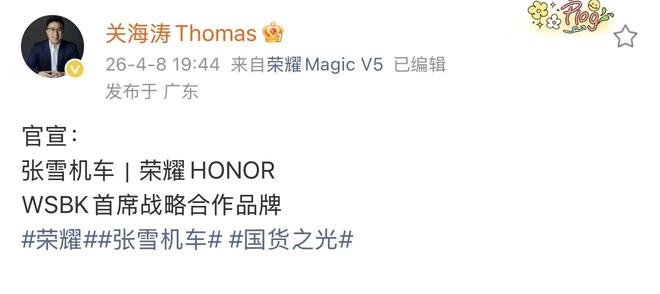 4月9日的消息显示,荣耀公司正与张雪机车进行联名合作。