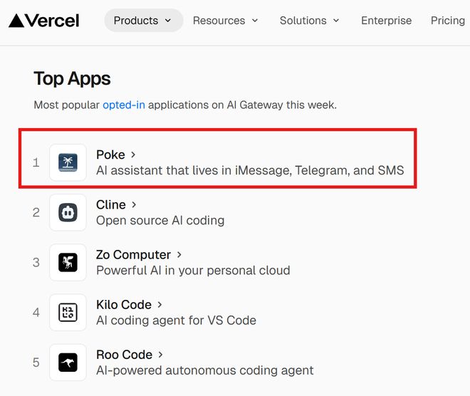 Poke还登上了开发者视角的AI产品/工具热度榜——Vercel AI的网关排行榜首位。
