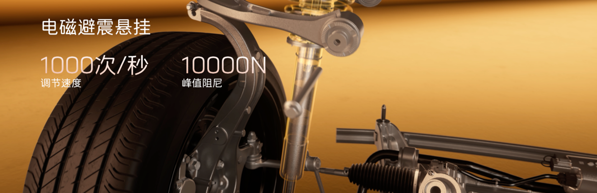 悬架系统也进行了全面升级。MAX版车型采用与法拉利同款的电磁避震器,拥有行业最快的系统响应速度,从最软到最硬的阻尼调节仅需10毫秒,每秒调节频率高达1000次。其超10000N的峰值阻尼力在飞坡等极限工况下对车身姿态控制能力极强。Ultra及以上版本配备了优化后的空气悬架+CDC,俯仰控制提升了20%,侧倾控制提升了9%,为用户提供更佳的驾驶体验。