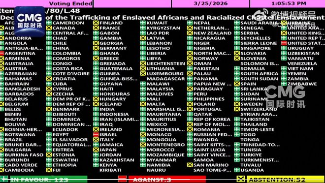 3月25日,联合国大会第80届会议召开,纪念“奴隶制和跨大西洋奴隶贸易受害者国际纪念日”,并审议并通过了一项决议,将贩卖非洲裔奴隶及种族化奴役行为视为最严重的反人类罪行。