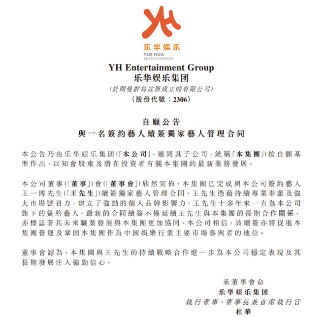 公告指出,本公司已与艺人王一博续签了独家艺人管理合同。王一博凭借其持续的专业表现和强大的市场影响力,成功塑造了个人品牌。自十多年前加盟以来,王一博一直是公司的签约艺人。此次续约不仅巩固了双方长期的合作关系,也预示着未来双方将在职业发展上更加紧密地合作。