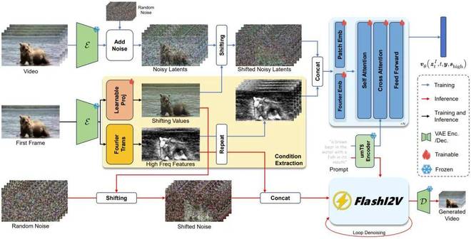 FlashI2V 架构示意图:条件图像潜在变量首先被投影和偏移,以形成隐式编码条件信息的中间表示。同时,图像经过傅里叶变换后的高频幅度与带噪潜在变量拼接,并输入到 DiT 主干网络中。在推理过程中,去噪从偏移后的噪声开始,并沿着常微分方程 ODE 轨迹进行,直到重建出最终视频。