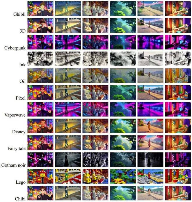 以往的视频风格化多依赖后期叠加滤镜,缺乏对画面内容的深度融合。为了打破这一局限,研究团队构建了一个包含 12 种典型艺术风格(如吉卜力、 3D 渲染、水墨画、乐高风等)的专属数据集,并在统一框架下推出了全新的 I2SV(图像到风格化视频)范式。