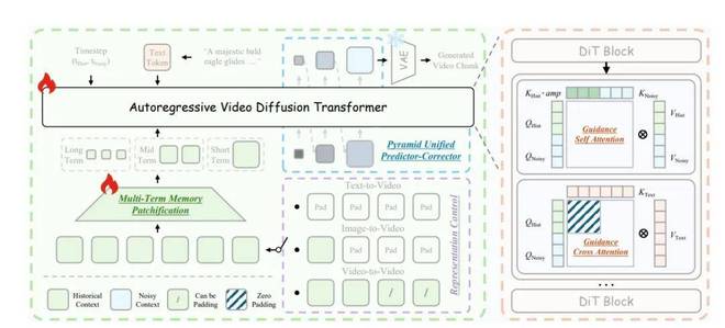 上图展示了实时长视频生成的实际架构:一个自回归视频扩散 Transformer,基于 Guidance Attention 模块构建。它通过 Multi-Term Memory Patchification 和 Pyramid Unified Predictor-Corrector,对历史信息与当前噪声上下文进行压缩,从而降低计算开销;同时通过 Representation Control 实现对 T2V(文本生成视频)、I2V(图像生成视频)和 V2V(视频生成视频)任务的统一建模。