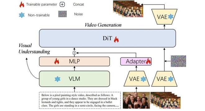 随后,通过一个专门设计的轻量级可训练 Adapter 模块,这些高维语义在特征维度上与 DiT 主干网络实现了精准对齐。