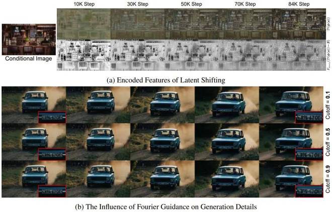 潜空间偏移和傅里叶引导分析。(a) 随着训练的进行,可学习的投射 ϕ(・) 逐渐强调条件图像中的详细信息。(b) 当使用较低的截止频率百分位数时,会注入更多高频信息。当截止频率百分位数设为 0.1 时,视频末尾的图形文字保持不变,而当截止频率百分位数设为 0.9 时,图形文字变得无法识别。