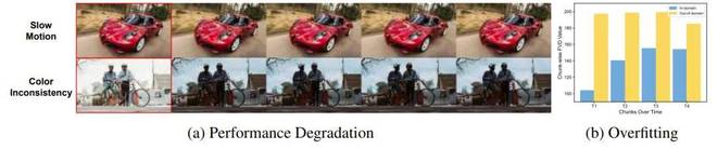 条件图像泄漏。(a) 如 Wan2.1-I2V-14B-480P 在 VBench-I2V 上的结果所示,条件信号的泄漏会导致生成质量下降。(b) 分块式 FVD 在领域内数据上增长,但在领域外输入上保持高位,表明传统 I2V 模型的泛化能力较差。