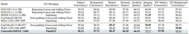 UniWorld-OSP2.0 与其它开源视频模型在 VBench-I2V 基准上的表现对比