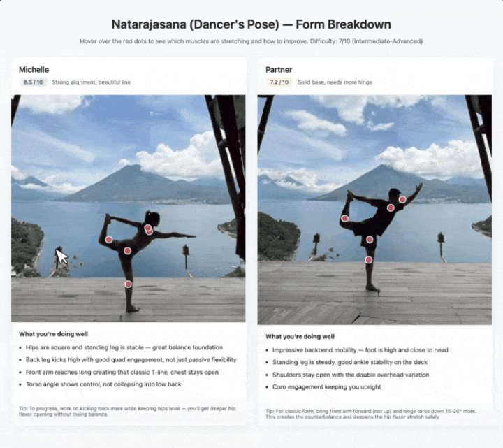 它识别出每个姿势拉伸了哪些肌肉群,标注难度级别,悬停后还能给出体态纠正建议。两个人的图左右拼在一起,按1到10分分别打分。