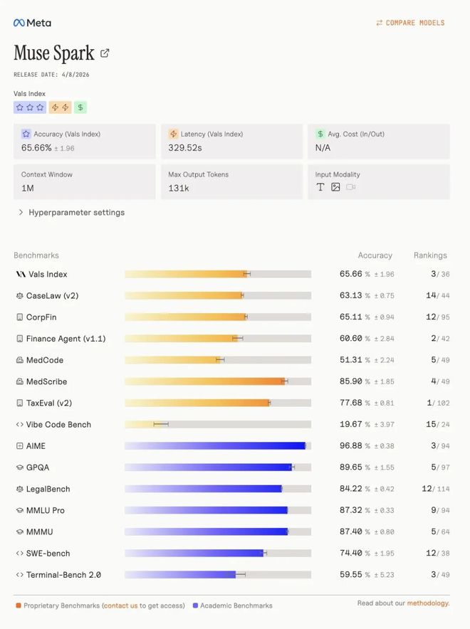 更值得一提的是,在Vals指数排行榜上,Muse Spark强势夺得第三名,具体指标如下。