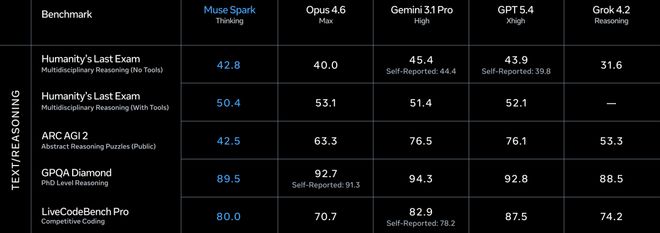 Humanity's Last Exam(无工具),Muse Spark沉思模式拿了50.2,Gemini Deep Think 48.4,GPT 5.4 Pro 43.9。