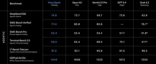 Meta自己也承认了,在代码和长时间Agent任务上,Muse Spark和最强模型还有差距。