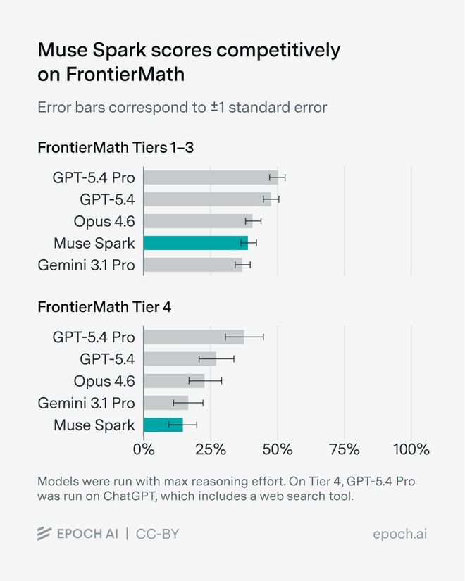 此外,在由数学大佬出题的FrontierMath上, Muse Spark在1-3层级上,直接碾压Gemini 3.1 Pro,不过在4层级却排在了倒数。