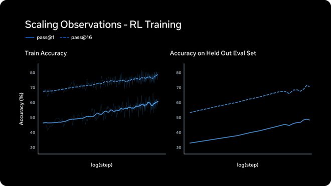 在强化学习(RL)方面,Meta的新技术栈表现出稳定的性能提升曲线,并能泛化到未见过的问题中去。