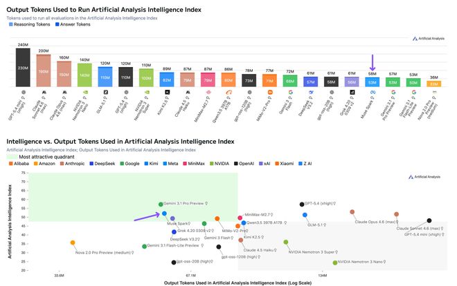跑完整个Intelligence Index测试套件,Muse Spark用了5800万输出Token,和Gemini 3.1 Pro(5700万)相当,但远低于Opus 4.6(1.57亿)和GPT-5.4(1.2亿)。