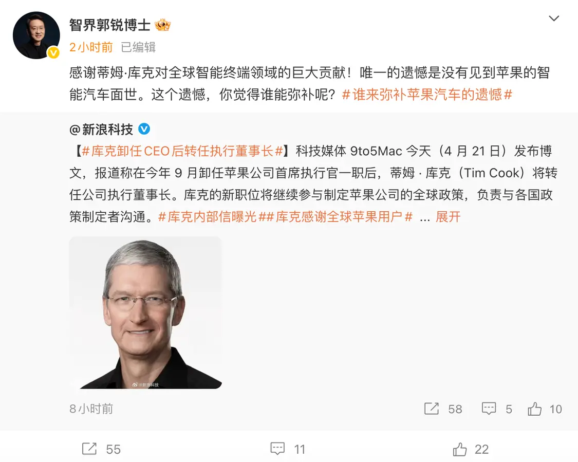 智界汽车公司的董事长兼首席执行官郭锐对库克在任期内所作出的努力表示了感谢,并指出苹果未能推出智能汽车项目是其任职期间的一大遗憾。