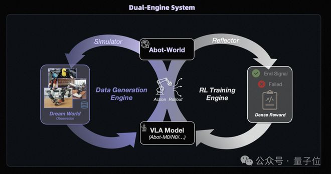 而当把两个引擎放在一起,你会发现ABot-World内部已经形成了一个持续增强的“数据-模型”飞轮。