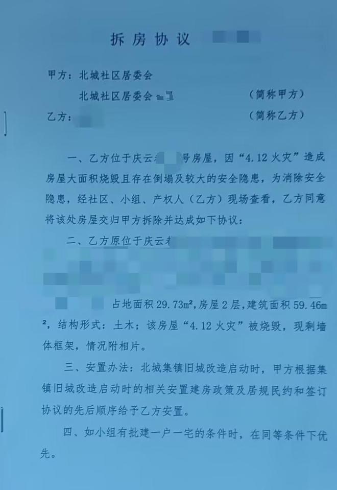 赵明向极目新闻记者提供了一份当时他与甲方北城社区居民委员会签署的拆房协议,拆房协议写明,赵明的老宅占地面积29.73平方米,房屋2层,建筑面积59.46平方米,该房屋因火灾被烧毁,现剩墙体框架,“因火灾造成房屋大面积烧毁且存在倒塌及较大的安全隐患,为消除安全隐患,经社区、小组、产权人(乙方)现场查看,乙方同意将该处房屋交归甲方拆除并达成协议”。