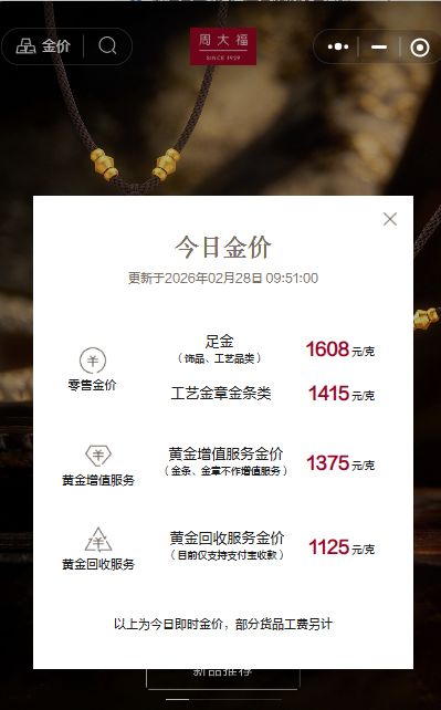 当日国内黄金饰品的价格数据显示,各大金店的金价普遍超过了1600元/克,相比前一天上涨了大约32元/克,最高达到了1608元/克。