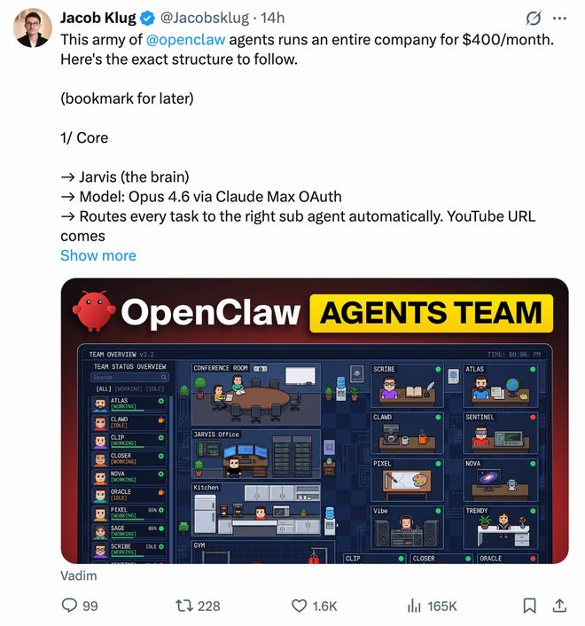 Vadim的公司在运营中使用了一种被称为“龙虾”的虚拟员工团队来处理各种工作任务,包括撰写研究报告、创作社交媒体内容和视频等,并支持推广其一款自动化编辑工具Vugola。尽管没有进行任何广告宣传,“龙虾”团队已经帮助公司吸引了超过450位用户。