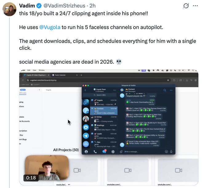 Vadim透露,利用这款工具可以自动下载YouTube上的热门片段并剪辑成短片或添加字幕,最后定时发布到社交媒体账户上。他预测,在2026年传统的社交媒体代理机构将会被淘汰。
