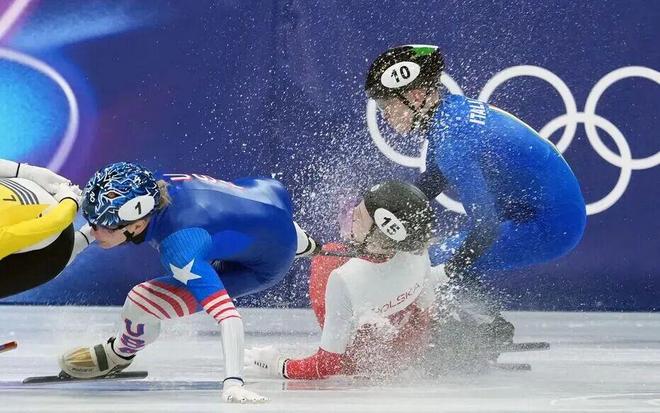 那是在女子1500米四分之一决赛中发生的事故,短道速滑本身就充满风险。比赛接近尾声时,美国选手桑托斯-格里斯沃尔德的一个动作引发了连环碰撞,导致包括意大利名将丰塔纳在内的几位选手摔成一团。