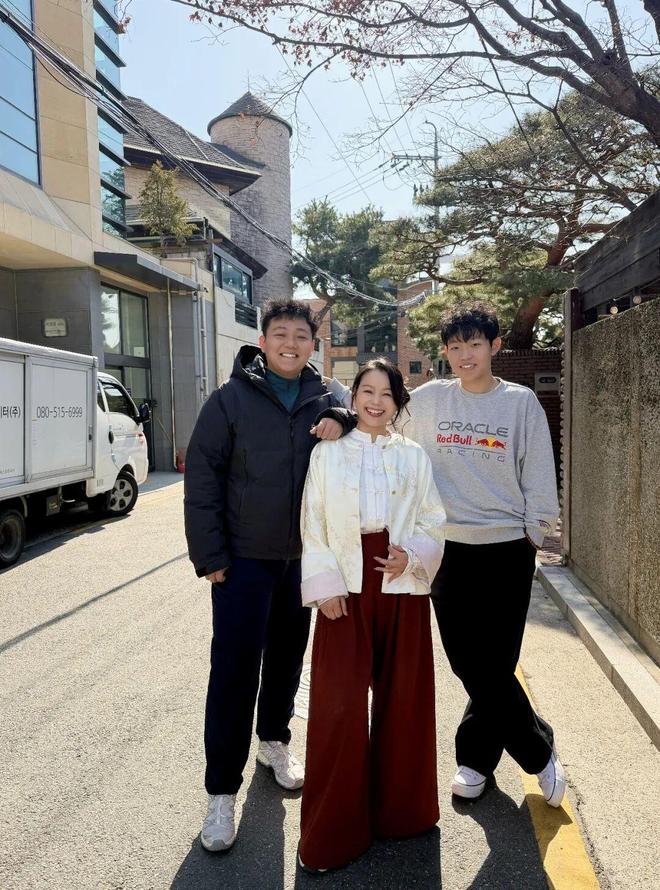▲ 今年3月,姜甲儒(右一)和哥哥带妈妈去韩国旅行。受访者供图